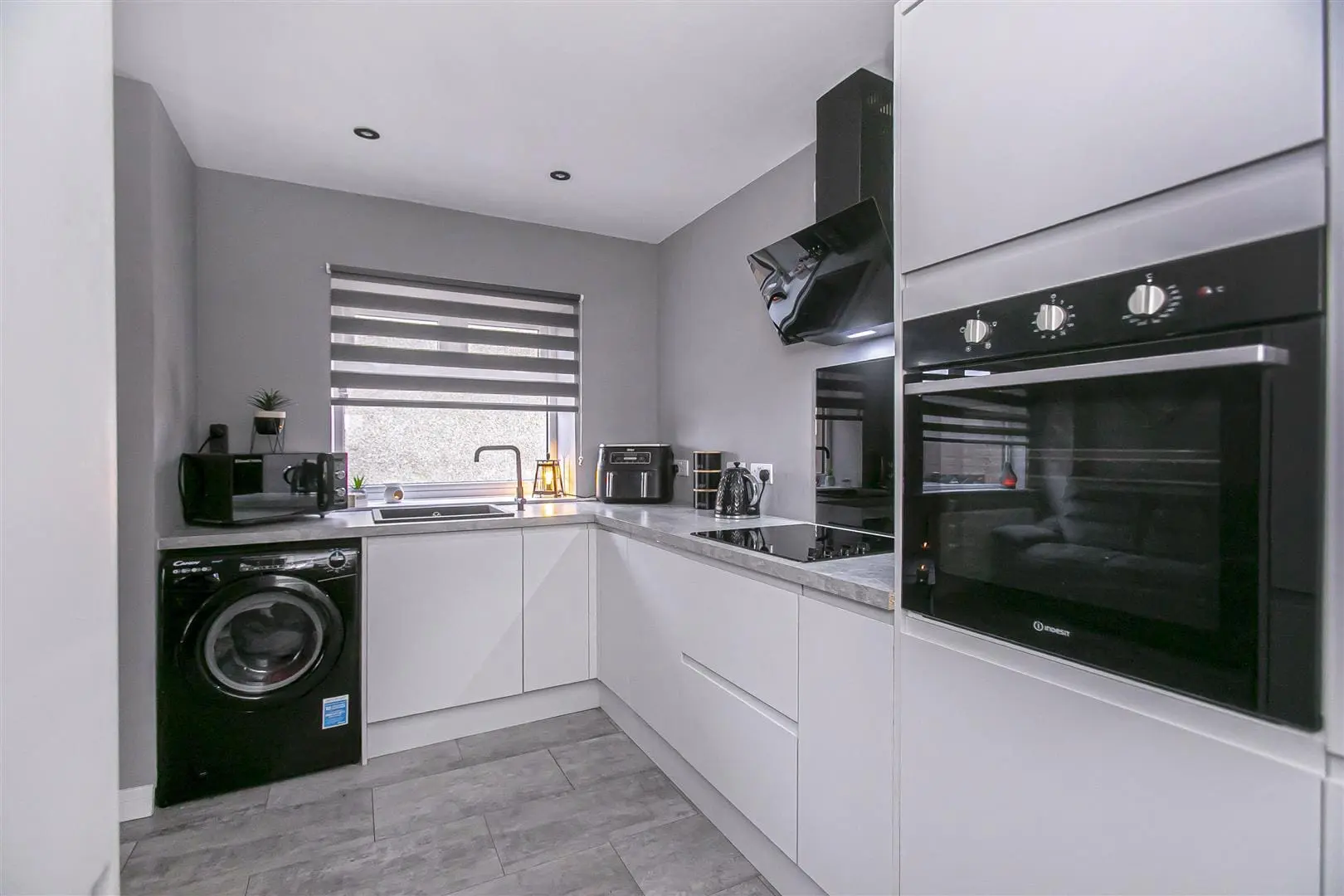 All floor coverings, blinds, bathroom and light fittings together with integrated appliances.