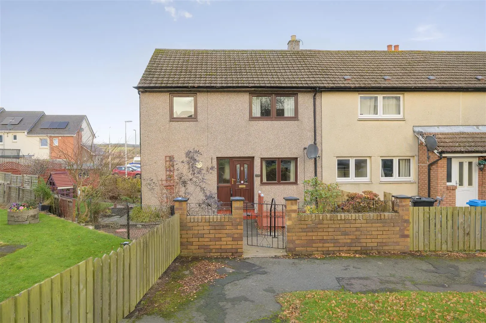 Excellent home for first time buyers, couples or small families. This end terraced villa occupies an enviable plot with good outdoor space and countryside views. The gardens are fully enclosed providing a child and pet safe environment. The property comprises entrance hall, lounge/dining room and kitchen with dining area on the ground floor. On the upper level there are three double bedrooms, modern shower room, good storage and access to attic. The property is double glazed with gas central heating. The property is non standard construction and may not be mortgageable.