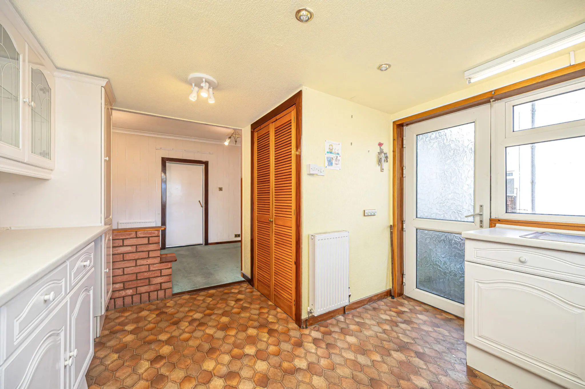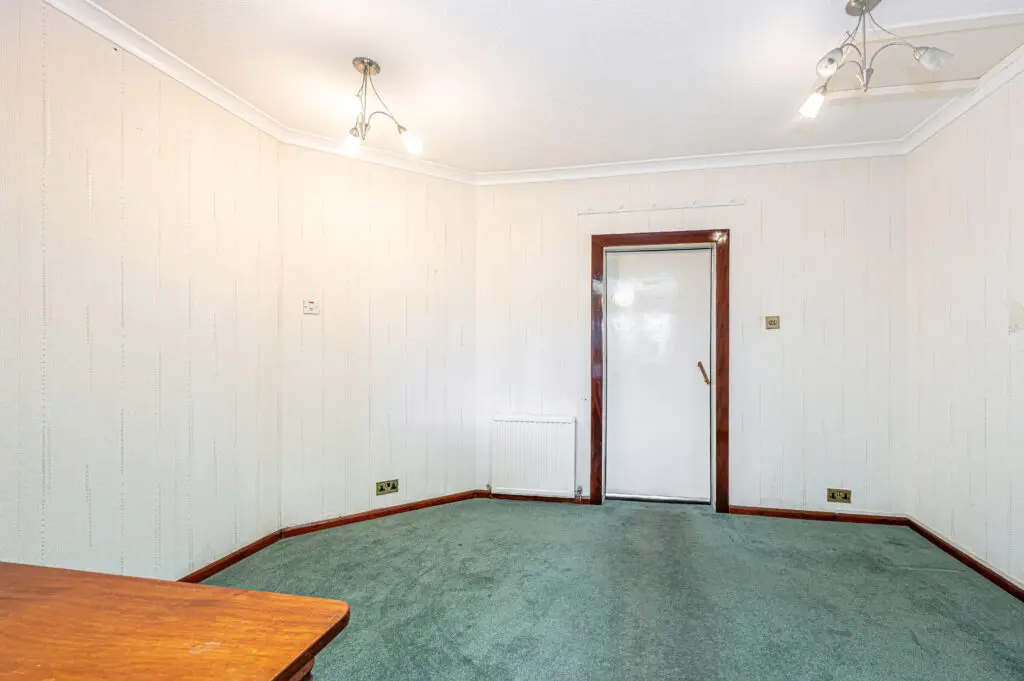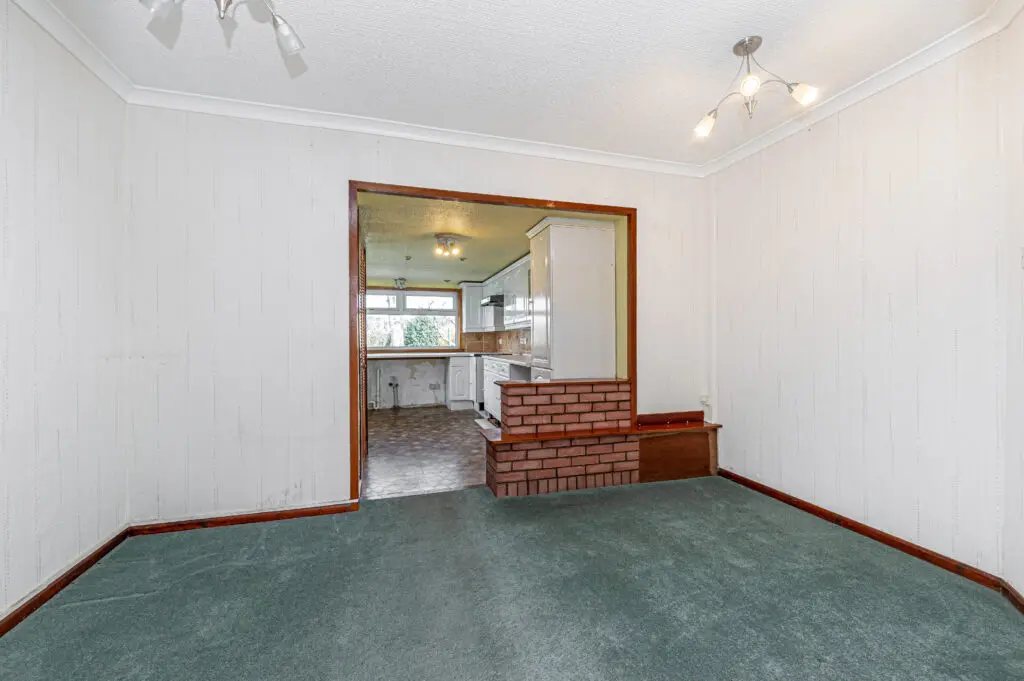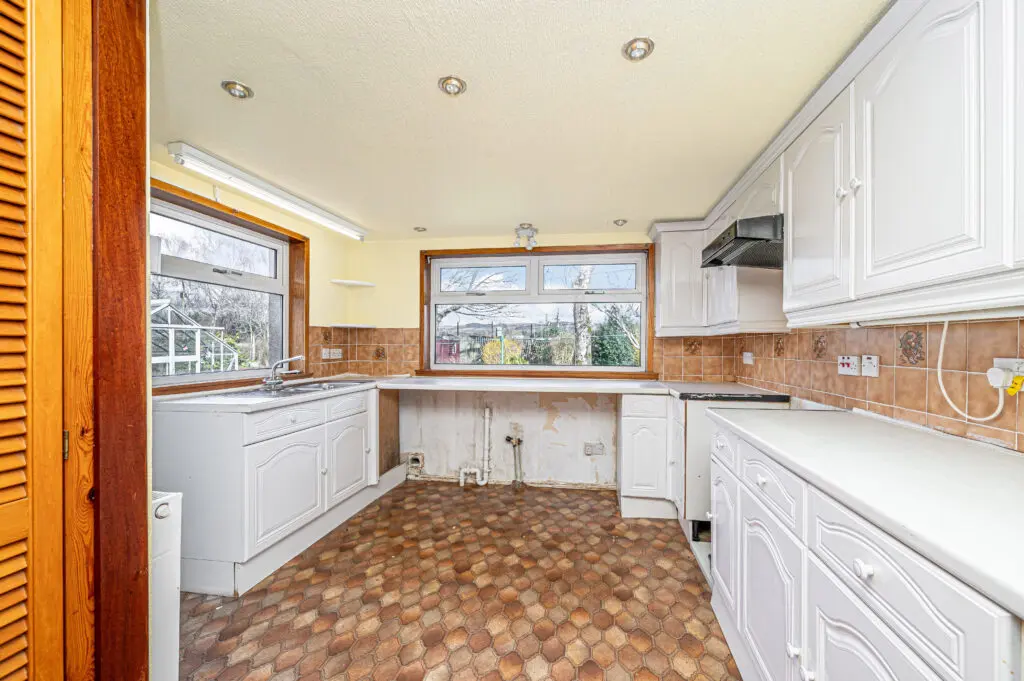 Entry is via a welcoming entrance hallway that leads to all accommodation, providing a practical and well-connected layout throughout. The bungalow features a bright and generously sized lounge, enhanced by a large picture window that fills the space with natural light and frames attractive views over the town. This room leads through to the dining room providing ample space for dining table and chairs with storage. To the rear, the good-sized kitchen enjoys a quiet outlook across the garden and towards open fields, offering plenty of scope for modernisation and redesign to suit contemporary living.